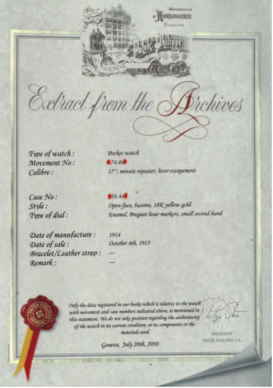 这家美国表店反应真快,第二天,陈先生就传来了我想要的文字资料:“瓷面完美没有发丝裂纹”,也传来了后盖内侧的相片。但相片反光看不清文字,这家美国表店对怀表没经验呢。我又如此这般给陈先生出了问题。第三天,我要的相片传来了,还传来了Archives的相片!哎呀呀,美国佬,你真的不会做生意,有原厂档案资料证明就早点“秀”出来吧!我原本正想委托张澍生兄,想学他有时相中古董PATEK PHILIPPE(百达翡丽),未出手就先替“别人”的表出一张原厂档案资料证明,确保是真货才出手。如果不是张兄说正常要一个月的时间,我就下“定单”了。这块PATEK PHILIPPE(百达翡丽)三问怀表带有所谓的“后补纸”就全对了嘛。全身上下没有一个Patek Philippe字样的PATEK PHILIPPE(百达翡丽)古董三问怀表,一般情况下,全世界表迷都不会承认是PATEK PHILIPPE(百达翡丽),但在刚结束不久的一场佳记日内瓦拍卖会上,一块这样的怀表(2010年5月10日Lot.287),品相并不好,就光凭一张“后补纸”,取得了“合法身份”,就轻易拍出了12万港元的价格!这块我想要的怀表有“后补纸”,原本我已经认为是全对的PATEK PHILIPPE(百达翡丽)三问怀表有什么问题?快点买呀,手快有手慢就没的啦!
