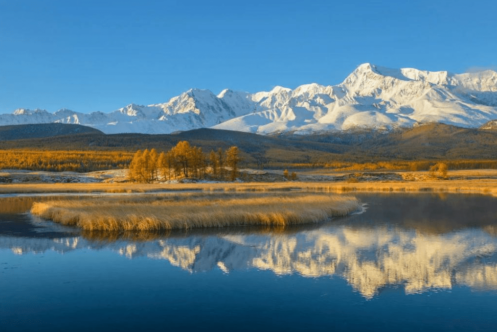 去阿尔泰山观雪山秋色 位于新疆的阿尔泰山脉, 高山区终年被冰雪覆盖, 金黄的秋风吹过层林尽染, 秋色雪色共长天一片。