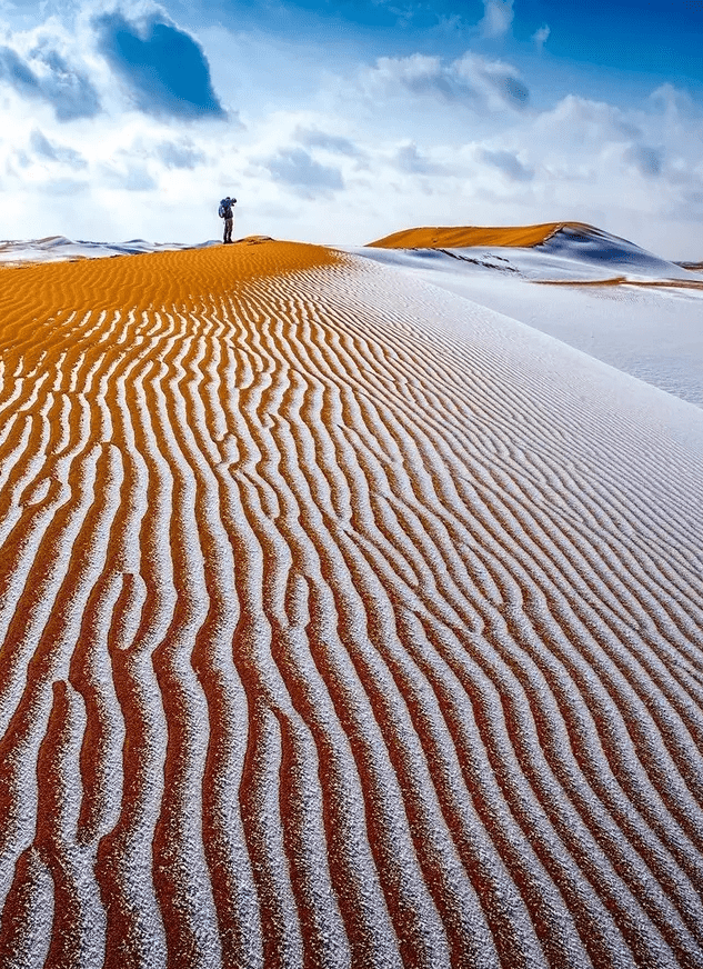 去张掖荒漠看大漠飞雪 罕见飞雪落在张掖无垠的沙漠上, 单调的黄色之上出现跃动的波纹, 亘古沉睡的大地焕发新的激情与生机。